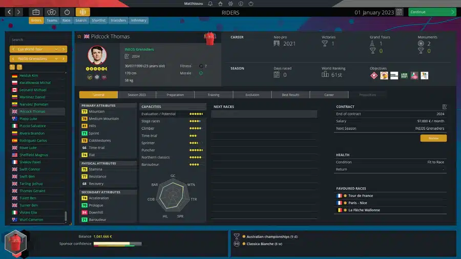 מצב Pro Cyclist שופץ לחלוטין ב-Pro Cycling Manager 2023, וכעת יש לך יותר חופש לנהל את הבחירות שלך. האימון הוא כעת מרכזי בקריירה ובהתפתחות של הרוכב שלך. קבע את רגעי המפתח של העונה ואת יעדי השיפור שלך כדי שתוכל לעמוד בקצב ההתפתחויות. הגיבו לכל אירוע בלתי צפוי וקבלו החלטות חדשות כדי להתמודד עם המצבים המעורערים ביותר של הקריירה שלכם! התפתחות גופנית, אימונים ספציפיים, הכנה מיוחדת למירוצים מסוימים וחיי חברה: זה תלוי בך כדי למצוא את האיזון הנכון לכל ההיבטים השונים תחתך שליטה כדי שתוכל לייעל את ביצועי הרוכב שלך ולהבטיח הצלחה!